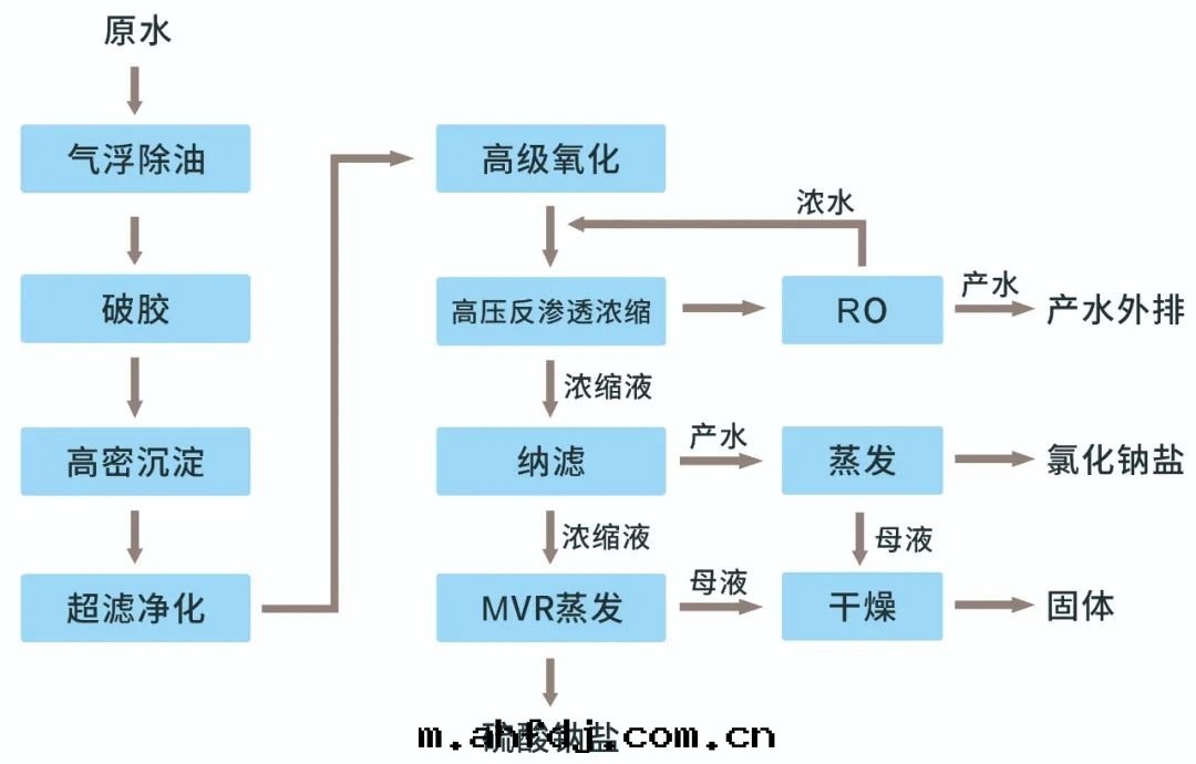 處(chù)理(lǐ)工藝:預處(chù)理(lǐ)+氧化(huà)+除硬(yìng)+高(gāo)壓反(fǎn)滲透減量(liàng)+蒸發(fà)