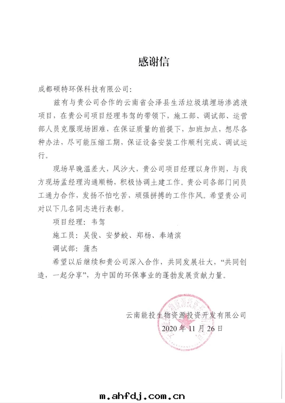 現(xiàn)场(chǎng)人(rén)員效率高(gāo)、不(bù)怕髒、不(bù)怕累、敢于(yú)吃苦(kǔ)的(de)工作(zuò)态度(dù)得到(dào)業主(zhǔ)的(de)高(gāo)度(dù)認可(kě),在安(ān)裝(zhuāng)工作(zuò)結束(shù)後(hòu),雲(yún)能集团(tuán)領導特(tè)意(yì)给会澤項目組發(fà)来(lái)一(yī)封(fēng)感(gǎn)謝信(xìn)。
